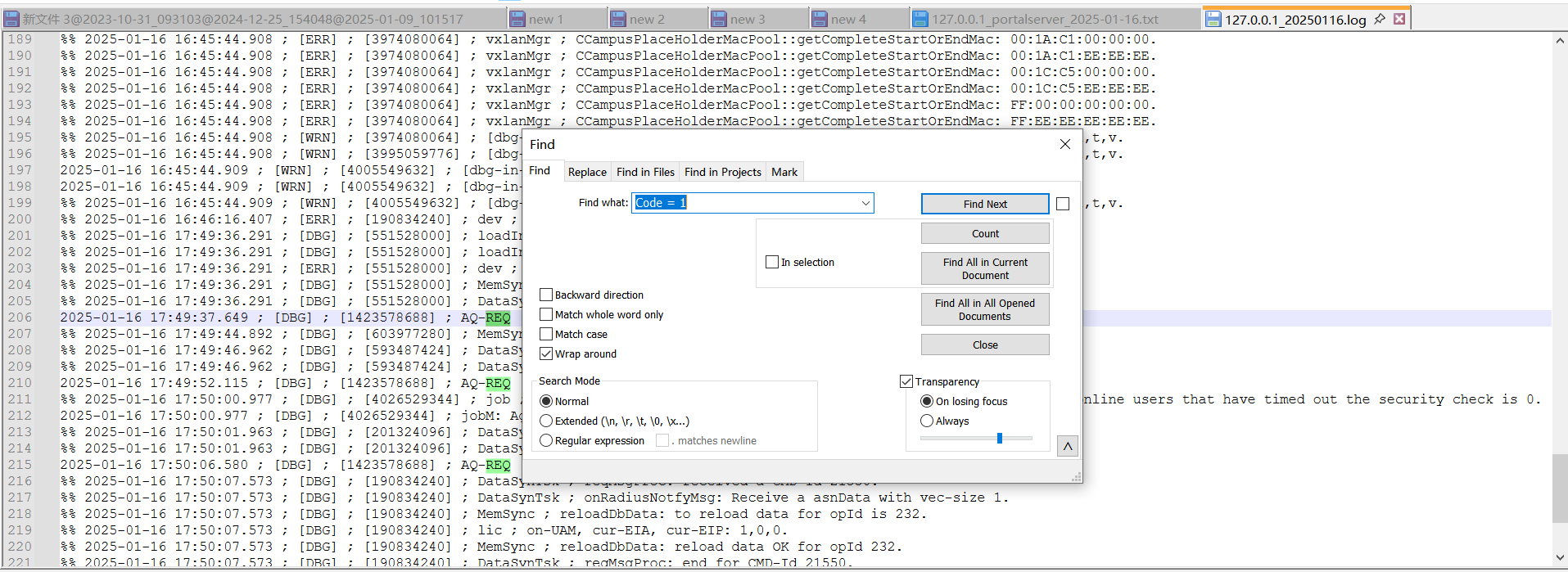 2、接下来查看uam的debug日志确认radius报文交互是否正常,设备是否有发起radius 1号报文,搜索Code=1,无结果,且查看对应时间段,设备没有发起radius认证请求报文,导致portal交互异常: