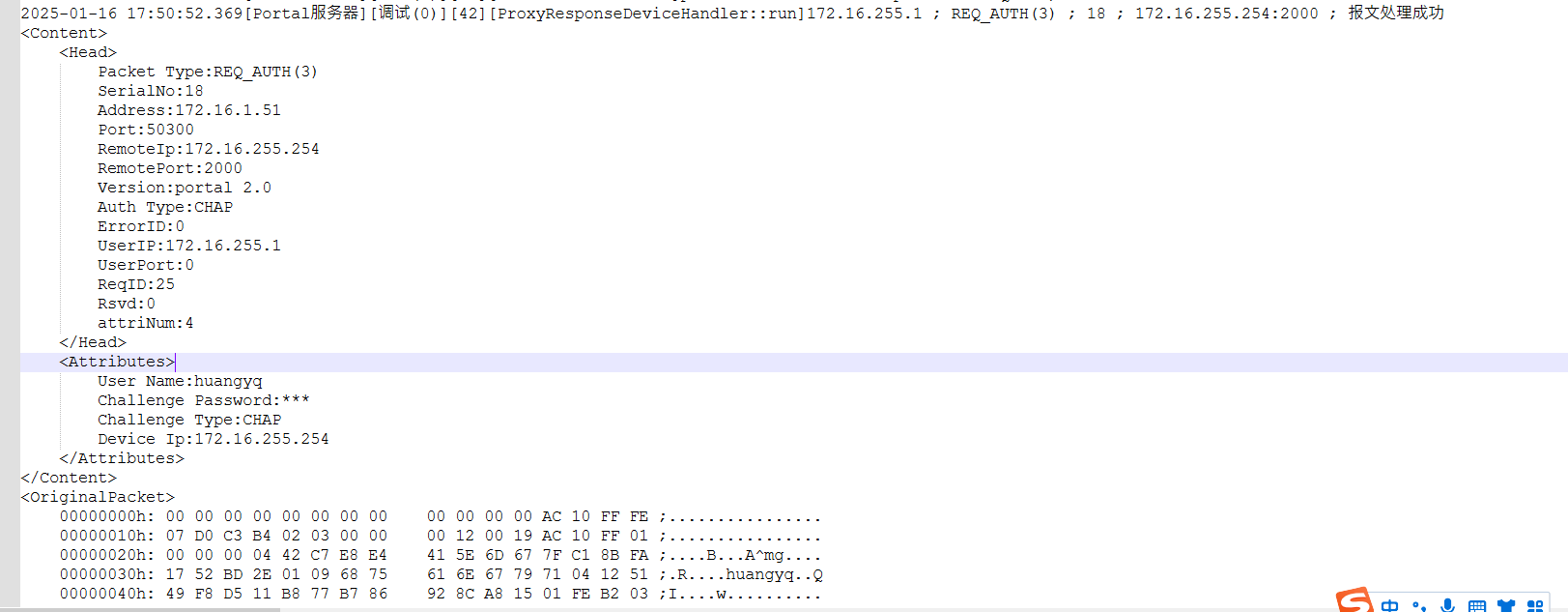 1、输入账户密码进行登录时出现报错,即说明认证进入了radius认证阶段查看portalserver debug日志,是否有给设备发生REQ_AUTH报文,查看日志,正常发送了