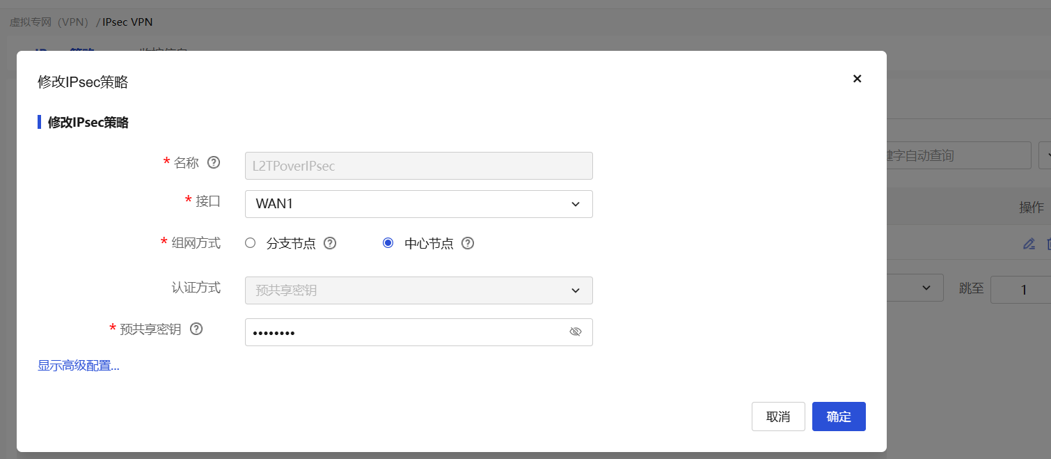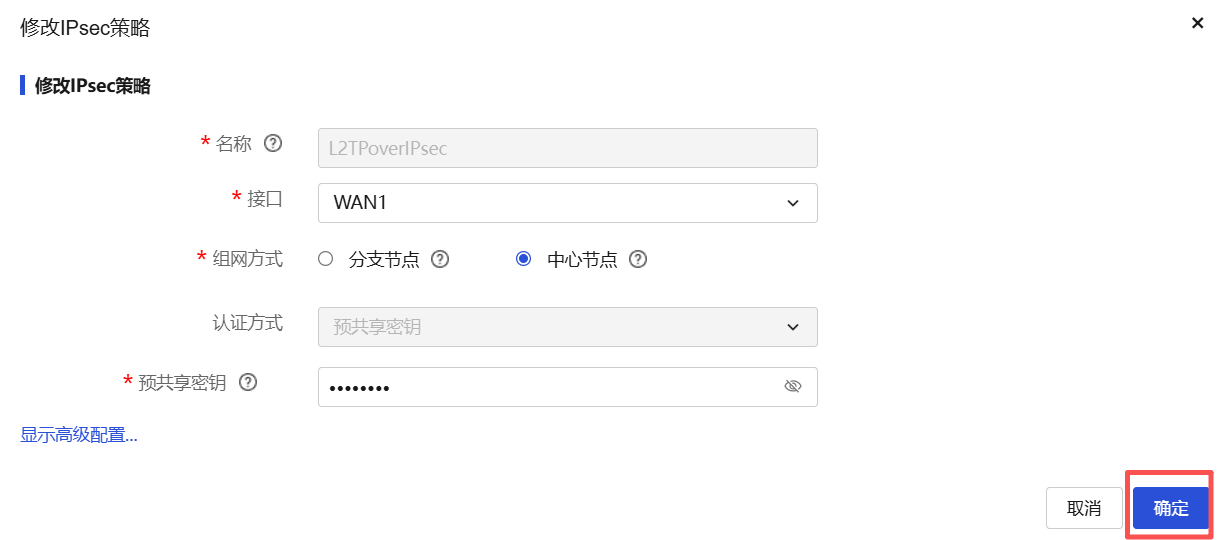 2、组网方式选择“中心节点”模式,设置L2TP over IPsec的密码在“验证密码”中。