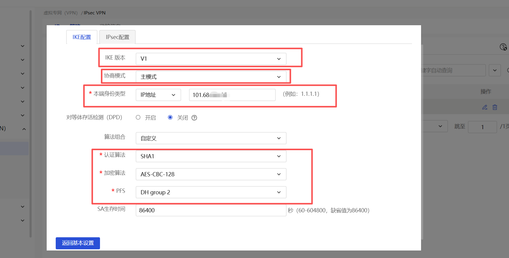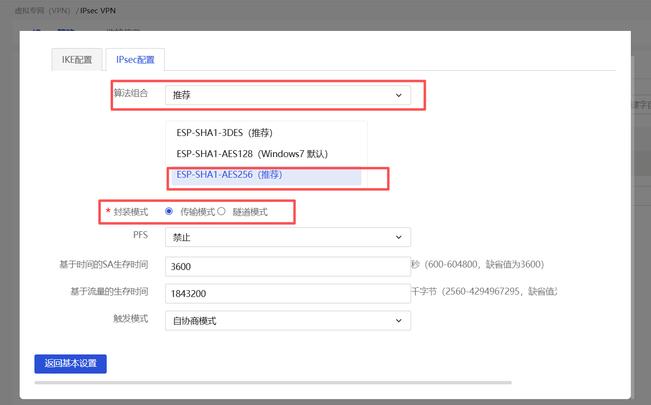 4、在“IPsec配置”中,“算法组合”选择推荐中的“ESP-SHA1-AES256”,“封装模式”选择“传输模式”,其他选择默认即可,点击“返回基本设置”,再点击“确定”即可