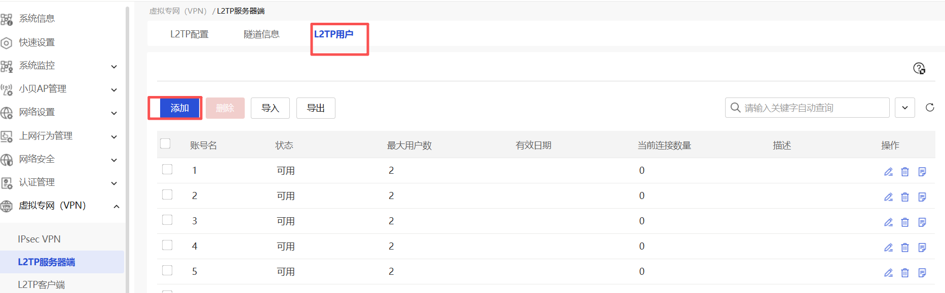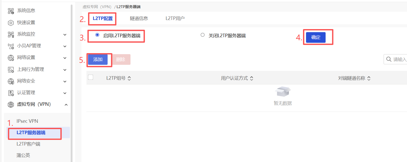 1、点击“虚拟专网(VPN)”→“L2TP服务器端”,点击“L2TP配置”,点击“启用L2TP服务器端”,点击“确定”,之后点击“添加”。