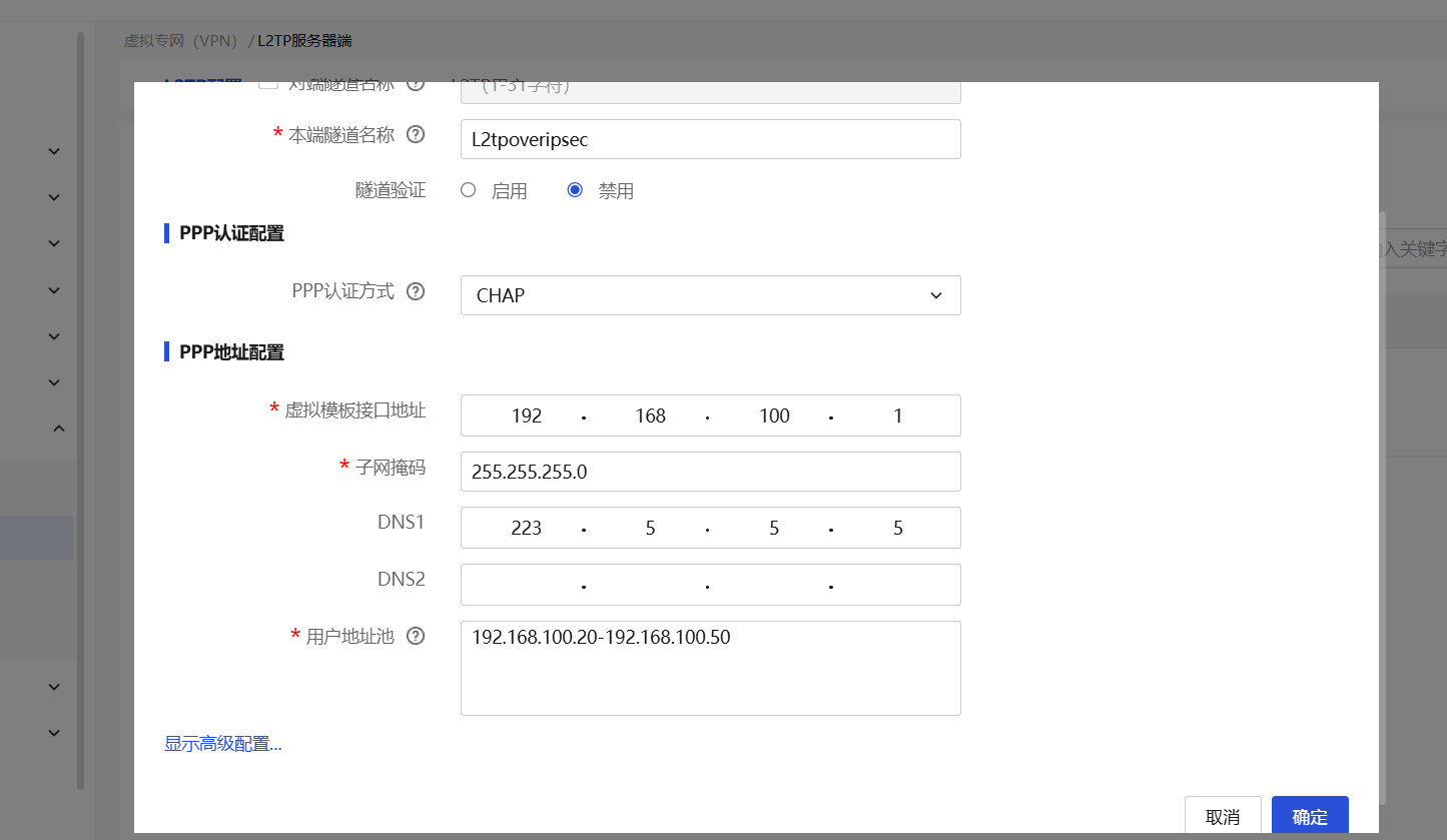 2、“对端隧道名称”不需要勾选,配置好“本端隧道名称”之后,不需要开启隧道验证,“PPP认证方式”选择“CHAP”,“PPP地址设置”不和内网任意vlan冲突/一样即可,之后点击“确定”,L2TP就配置完成了。