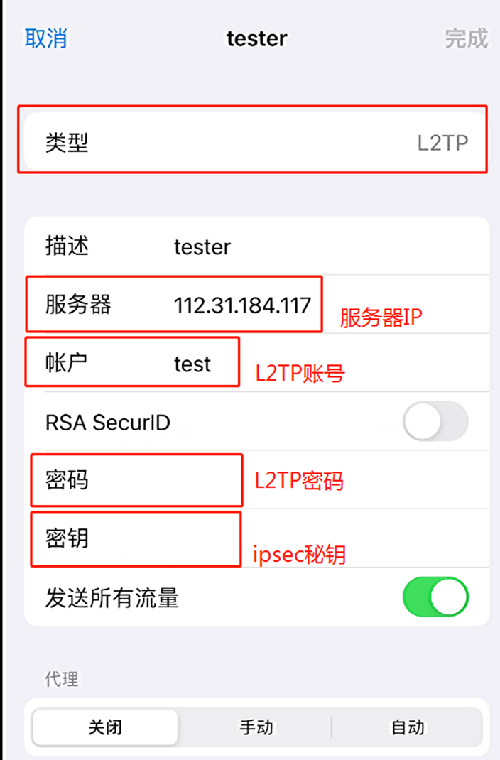 2、类型选择“L2TP”(苹果设备的L2TP实际为L2TP over IPsec),“服务器IP“填写UR/ERG3的wan口ip地址,”账号“和”密码“是UR/ERG3配置的L2TP用户的账户信息和密码,”密钥“是UR/ERG3的IPsec服务器的预共享密钥,代理保持关闭状态即可,点击右上角”完成“。