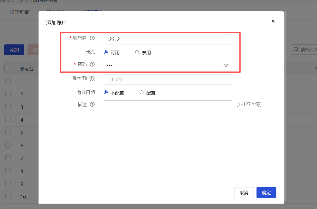3、添加L2TP用户:点击“L2TP用户”,点击“添加”,任意配置账户名称和密码,点击启用即可,之后点击“确定”。