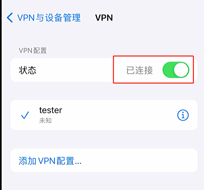 1、在设置中找到vpn与设备管理,点击“添加VPN配置”。