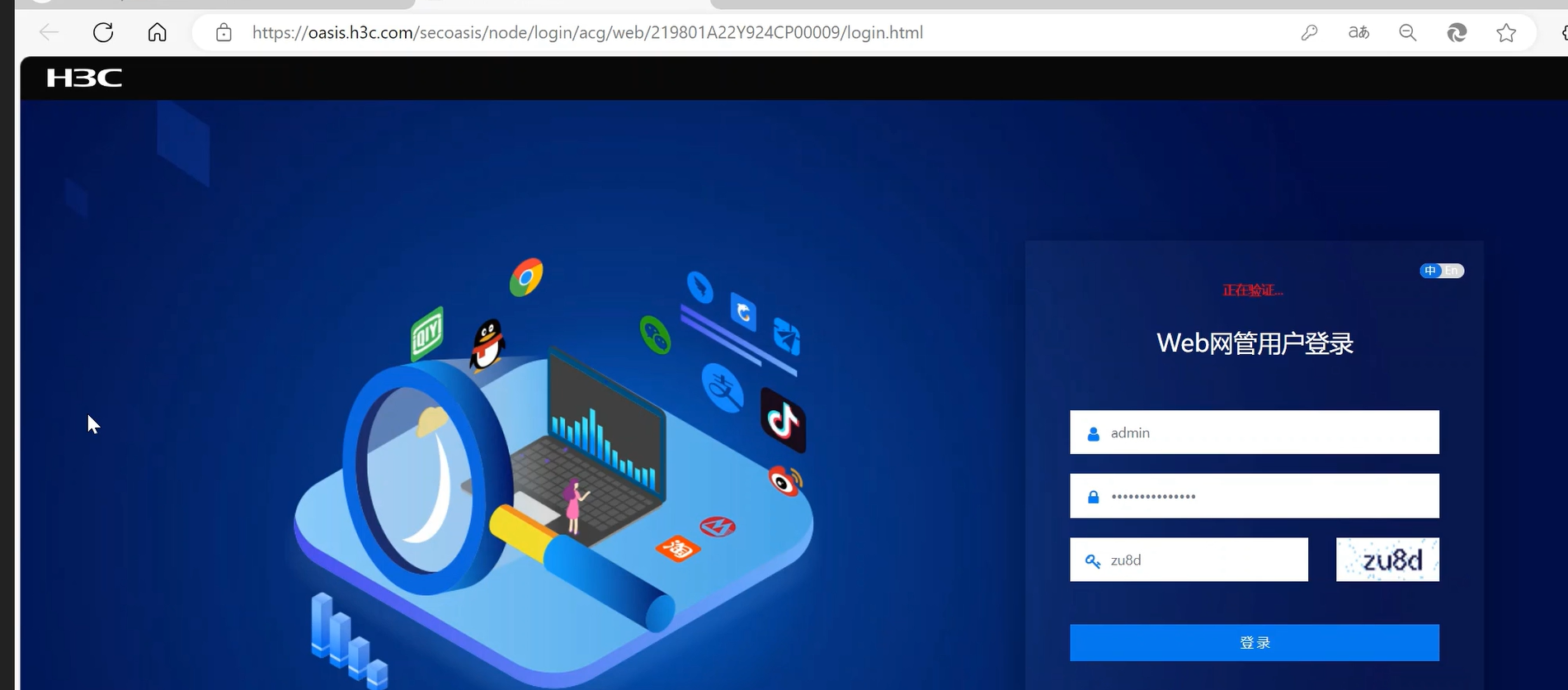 ACG1000注册到云简平台,在云简平台后点击本地管理,弹出输入账号密码界面,输入完正确账号密码后提示“正在验证”就没反应了。