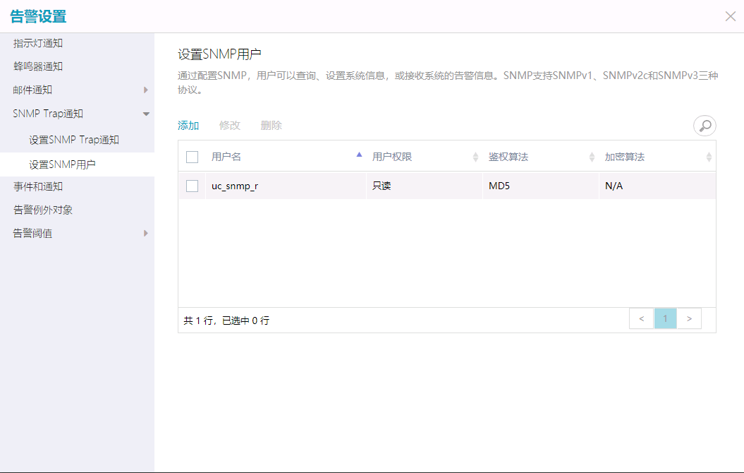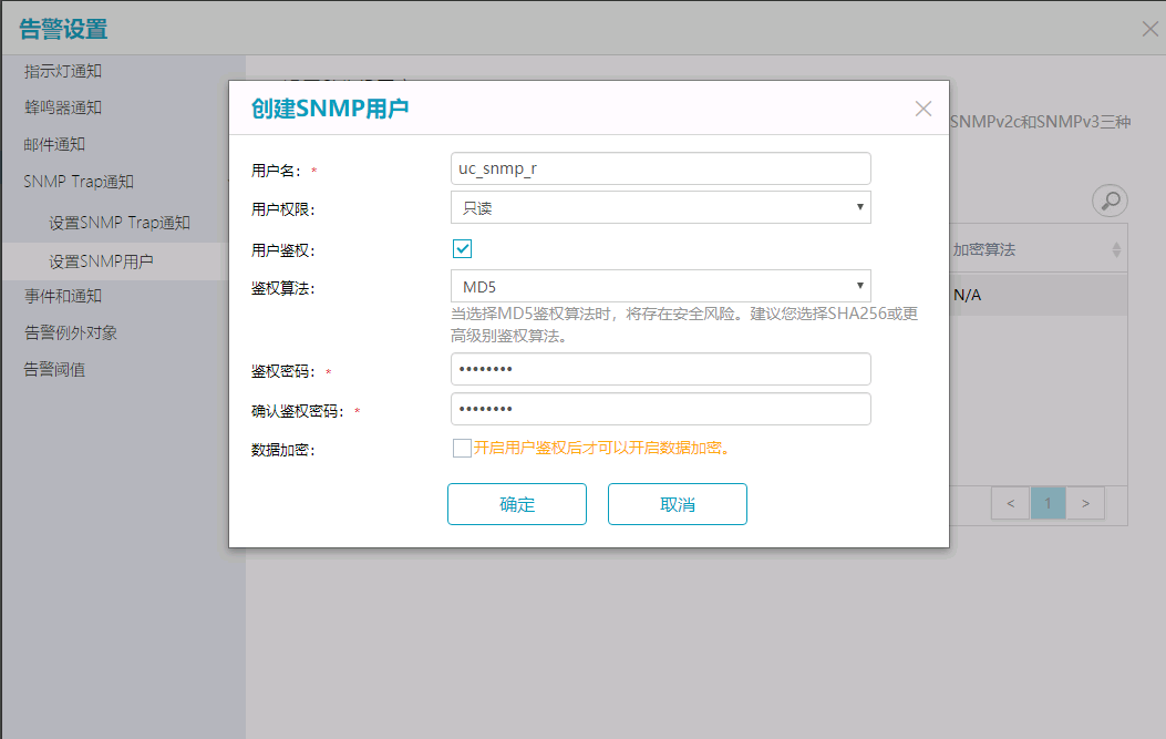 ②添加SNMP用户,一般设置只读用户即可,根据实际情况配置读写权限,UC与CF存储均支持多种加密与认证算法,这里我们使用最常见的认证算法MD5,不使用加密算法,UC侧配置MD5认证,存储侧也相应配置MD5认证即可,项目因安全考虑可配置其他的认证与加密算法