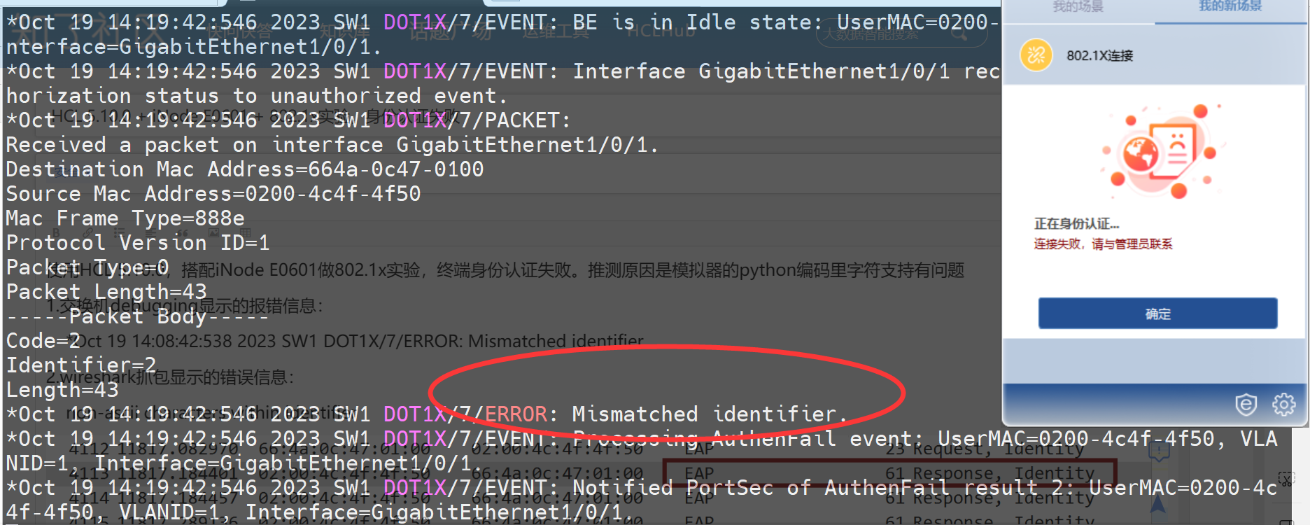 使用HCL 5.10.0,搭配iNode E0601做802.1x实验,终端身份认证失败。推测原因是模拟器的python编码里字符支持有问题