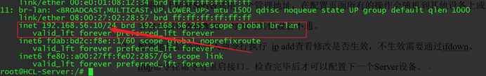 2. 配置地址后必须进入命令行执行 ip add查看修改是否生效,不生效需要通过ifdown、ifup命令在命令行重启接口。检查完毕后才可以配置下一个Server设备。