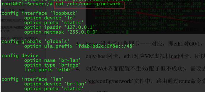 5. 如果Web界面配置不生效(配了但不成功),需要去CLI查看,IP地址保存在`/etc/config/network`文件中,路由通过route命令查看。可以直接在CLI中配置,不使用Web界面。