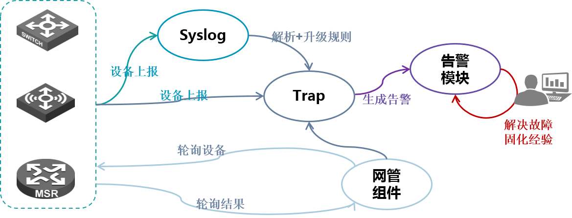 iMC中的告警分为三种:iMC轮询、设备的trap、设备的sytslog升级的告警;那么三类告警的产生原理,如果没有收到告警的排查思路是什么呢?